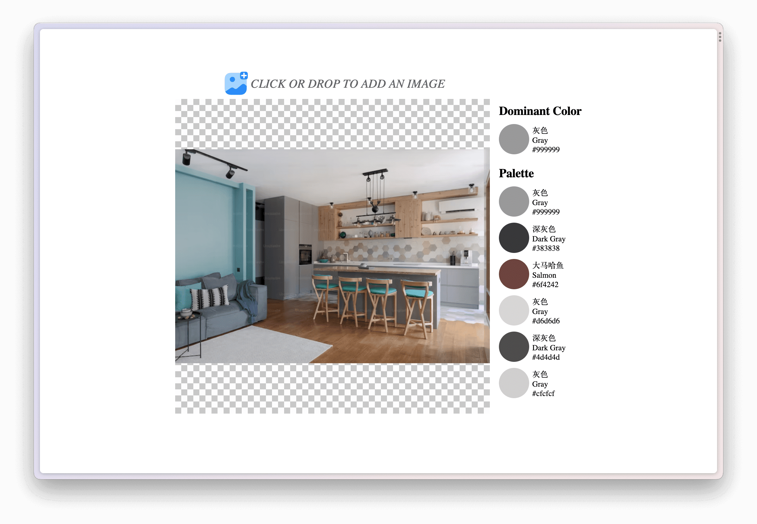 在此示例中,从图像中获得的颜色还包括一个 alpha 通道,它表示透明度。我们可以通过将 alpha 除以 255 来获得其介于 0 和 1 之间的值(对应于 CSS rgba 的 alpha 值)。如果它等于零,那么无论其 RGB 值如何,它都将是完全透明的颜色。