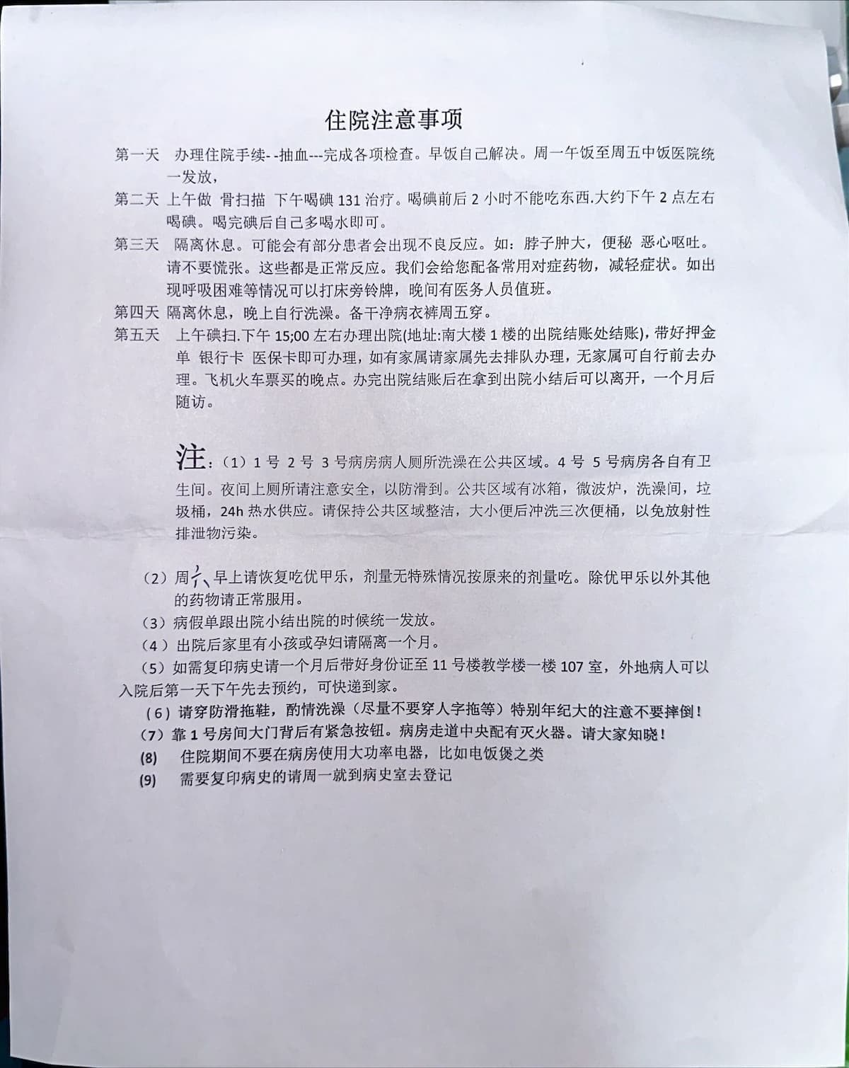 下午 1 点半开始排队喝碘,我喝的是 100mCi(医生会安排,病房里有喝 150mCi 的),给了一次性纸杯和吸管,先喝光,然后用自带的水加一点到杯子里再喝光,喝完丢进垃圾桶,回房。
