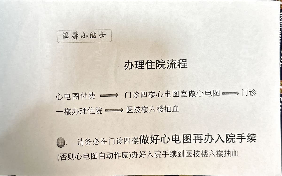 到病房门口医生会提示做抽血和量血压,做完就可以下楼去买水,多多的水,还有想买的东西都可以买。医生还会给一张住院注意事项。