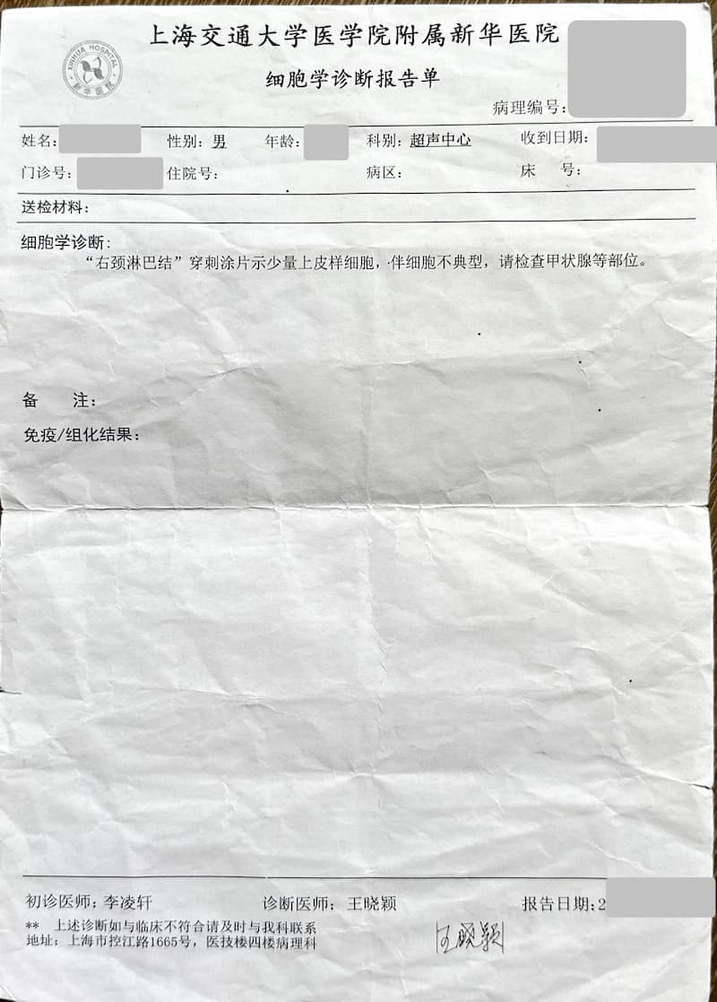 重新挂了门诊医生,请医生看穿刺报告,医生说这份报告什么都看不出来,让我挂血液科医生看,下午血液科医生看了以后说这个得甲状腺科看,退了我的挂号,无功而返。