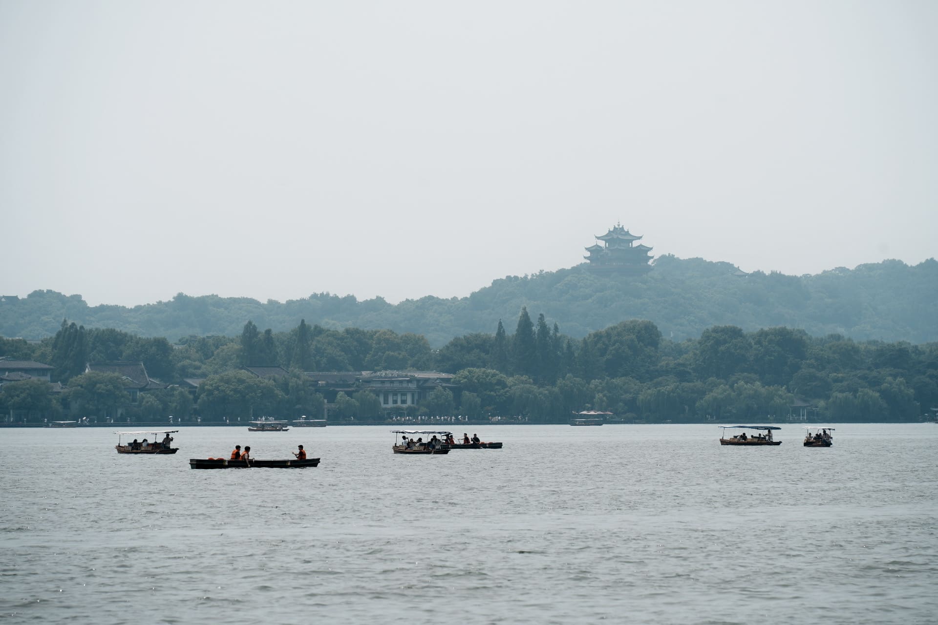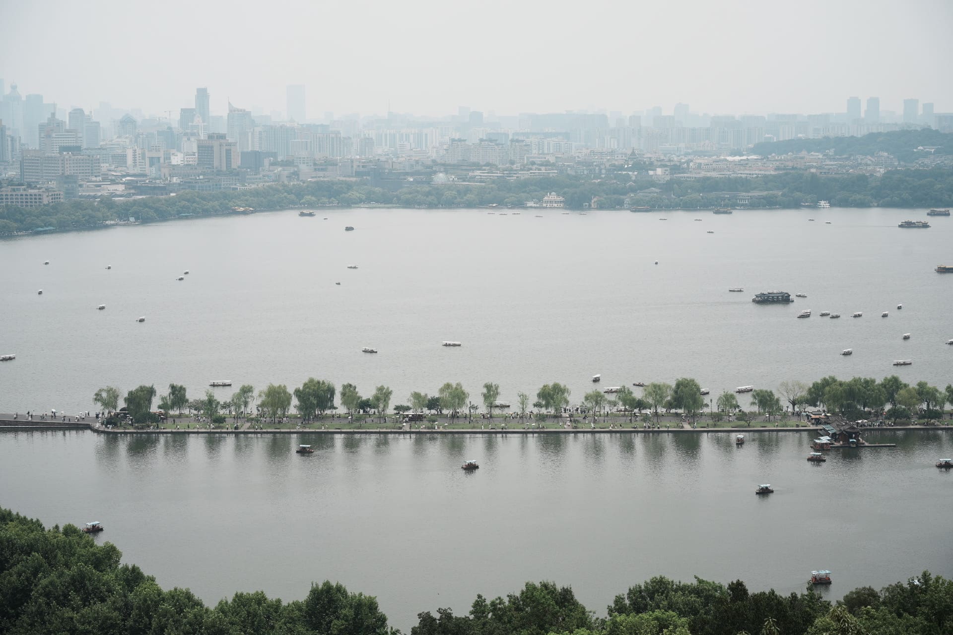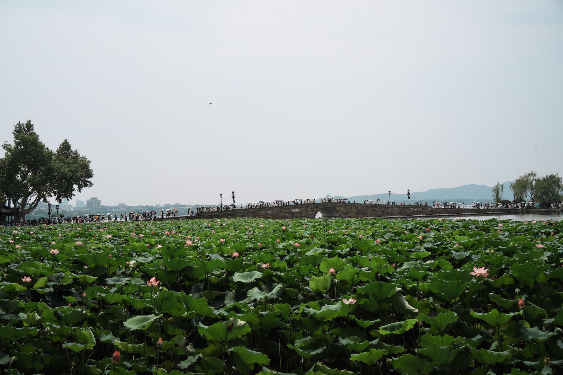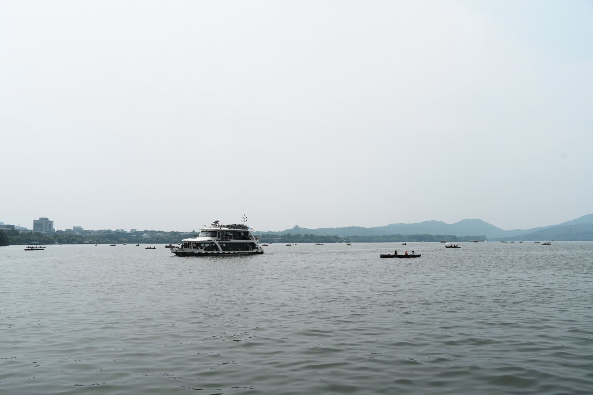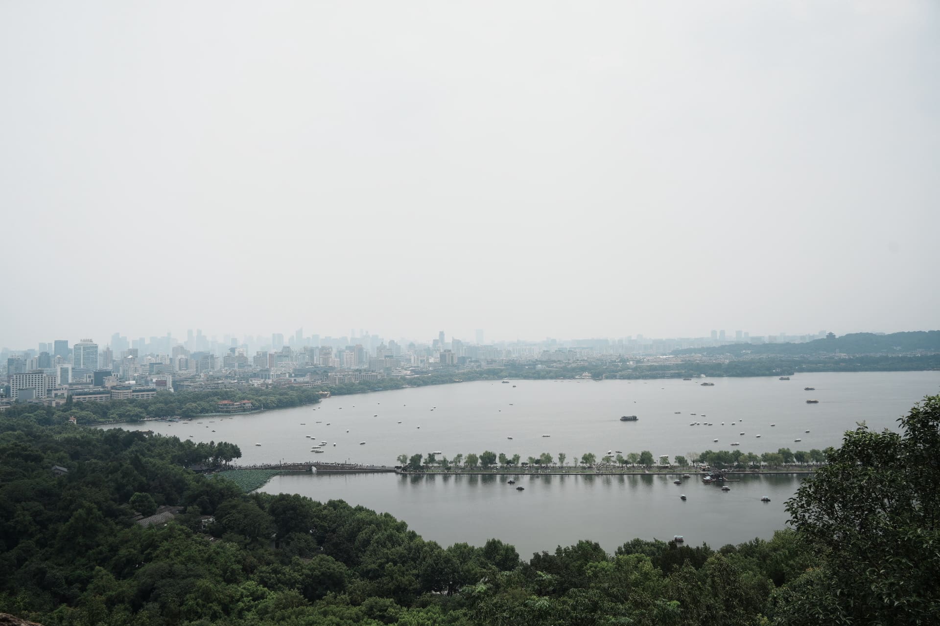 出来以后继续往湖边走,一会儿就看到了西湖。今天天气不是很好,闷热且云层厚,可见度也不算很高。