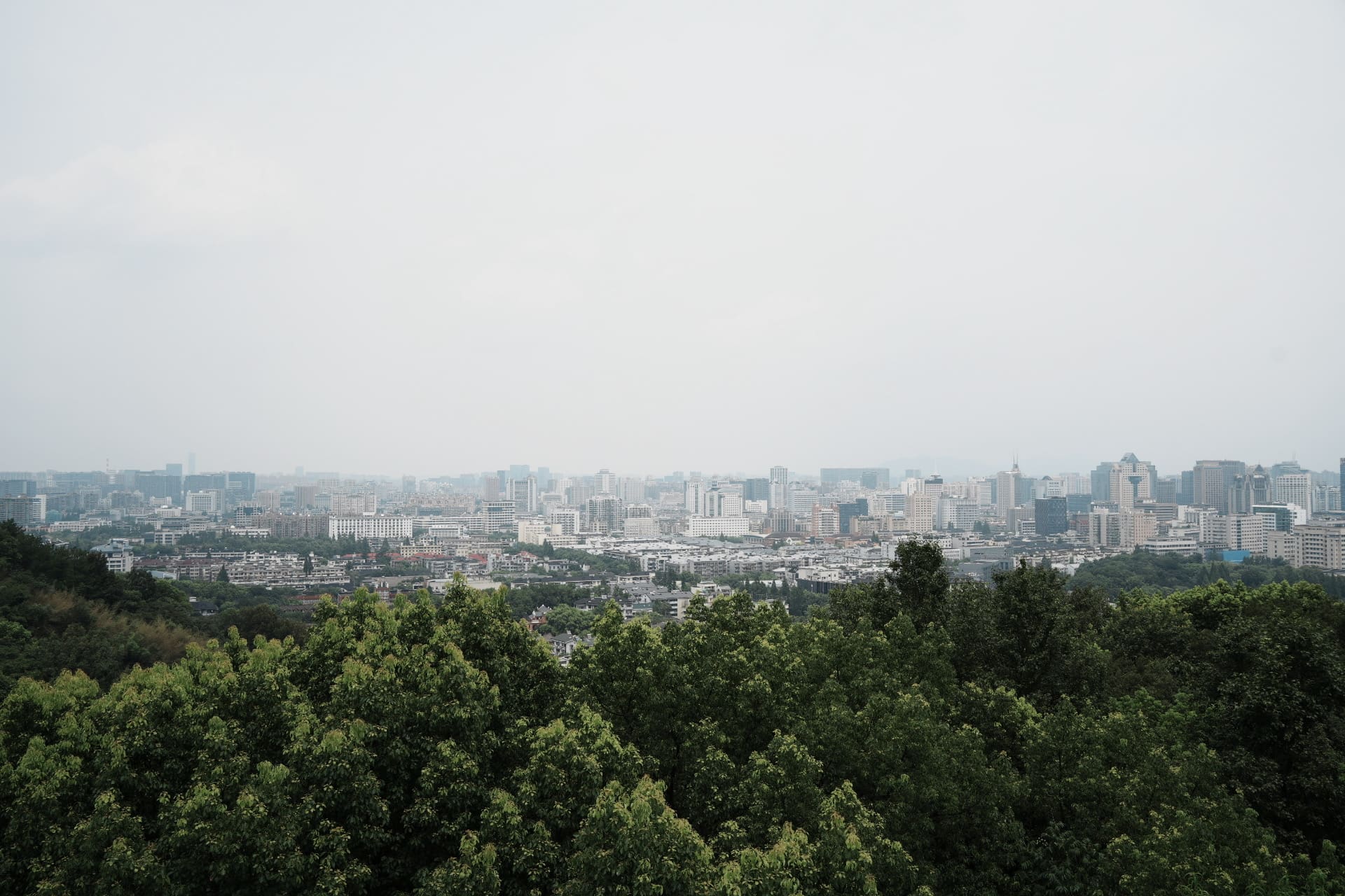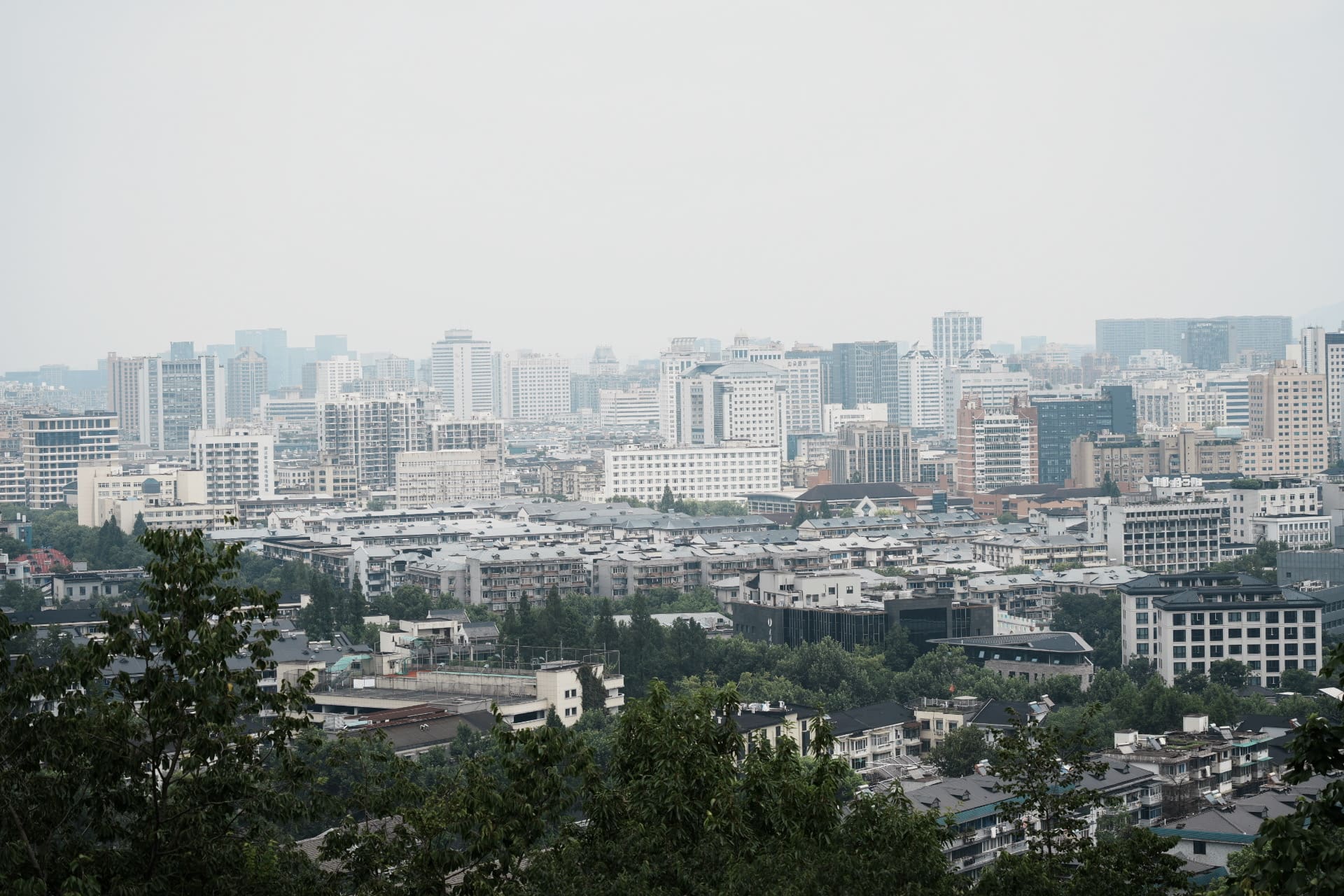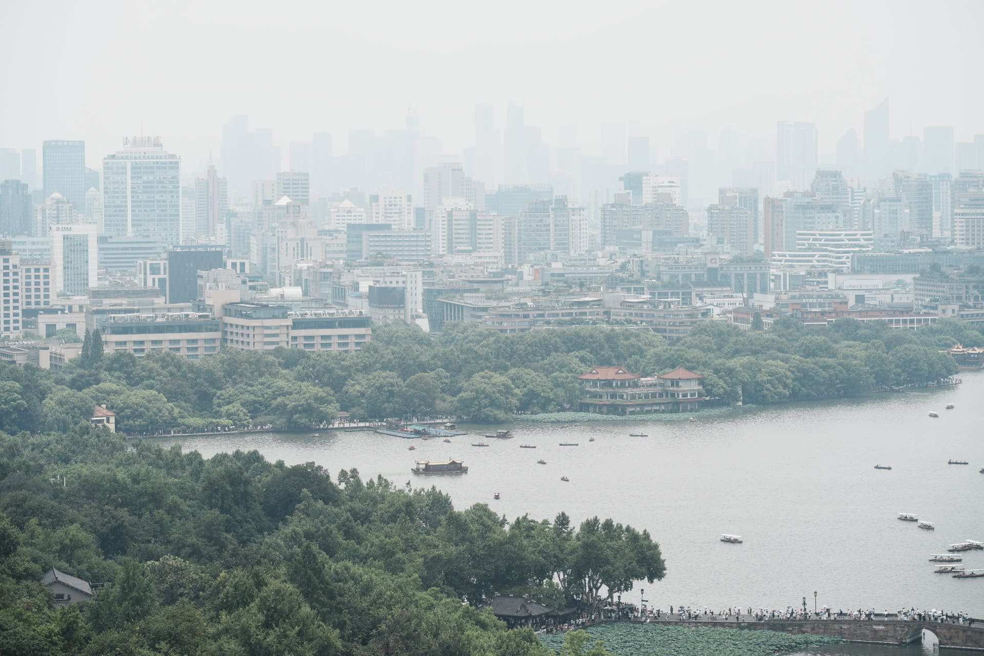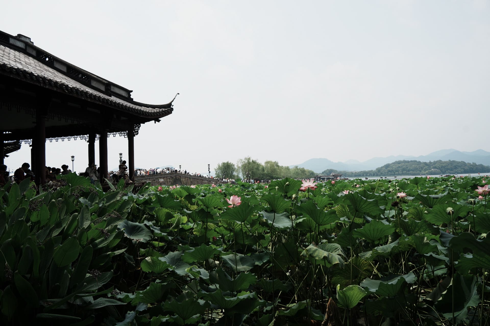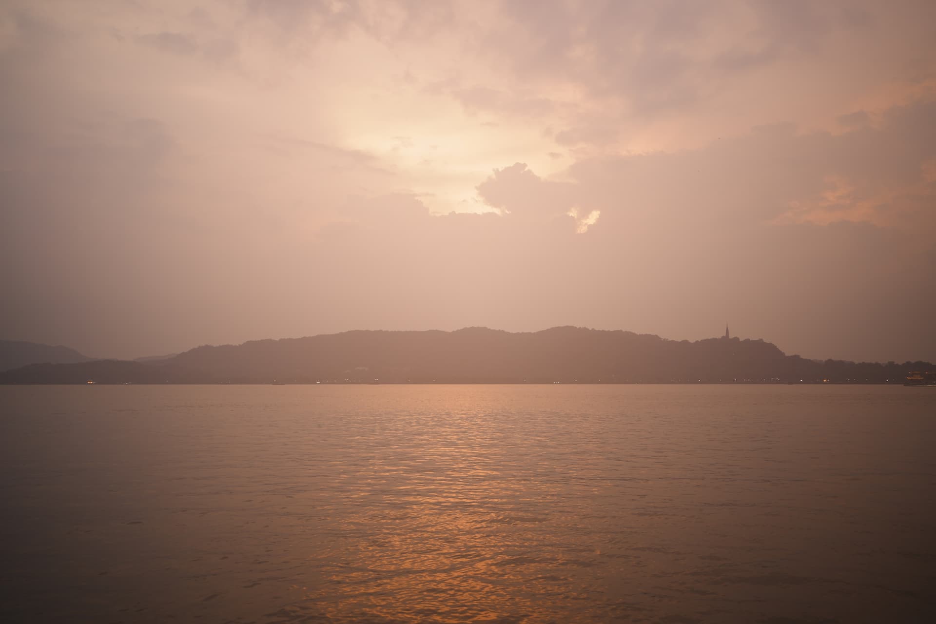 出来以后继续往湖边走,一会儿就看到了西湖。今天天气不是很好,闷热且云层厚,可见度也不算很高。