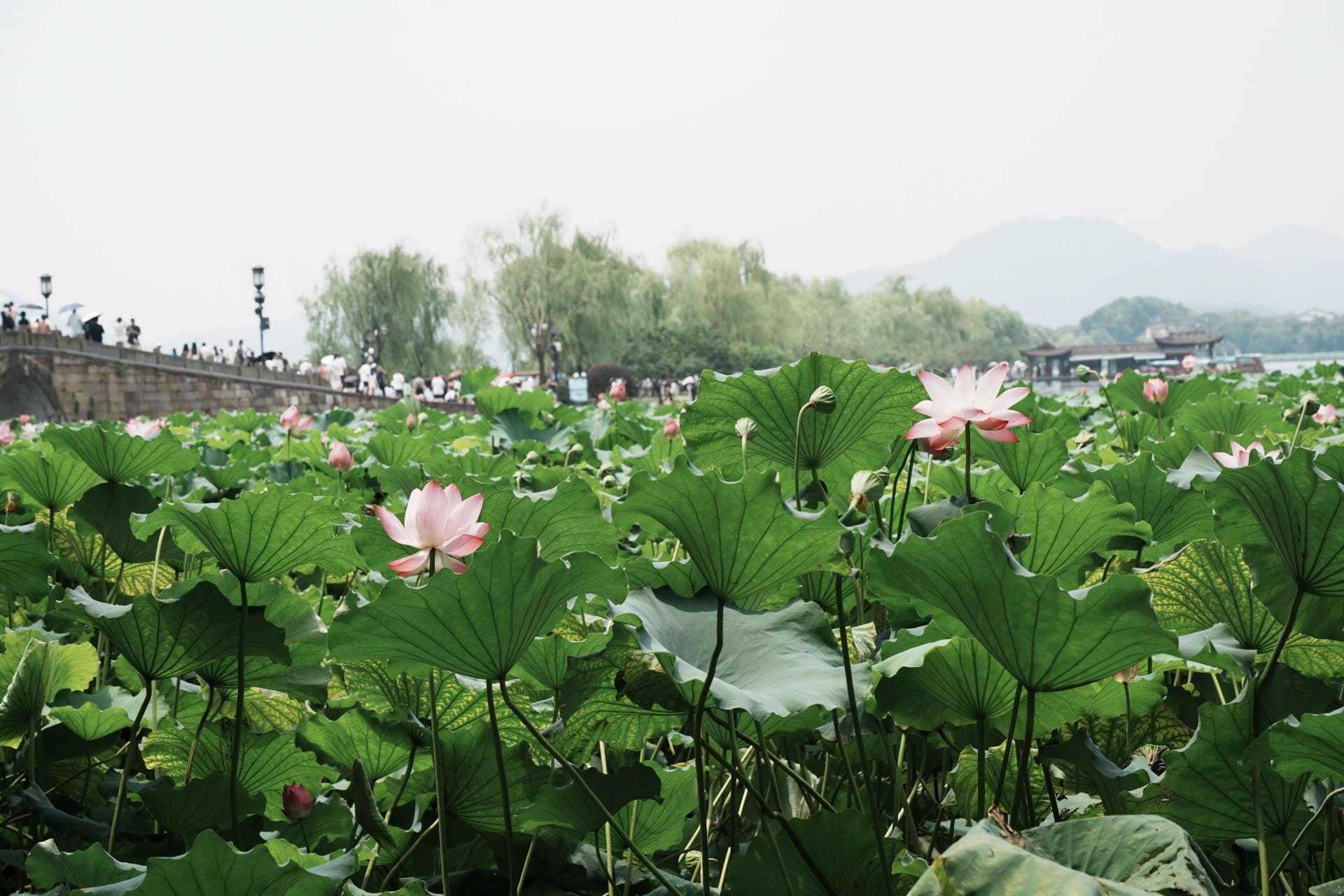 继续在西湖北面湖边走,不一会儿就走到了西湖十景之一“断桥残雪”。湖边种有一片荷花。