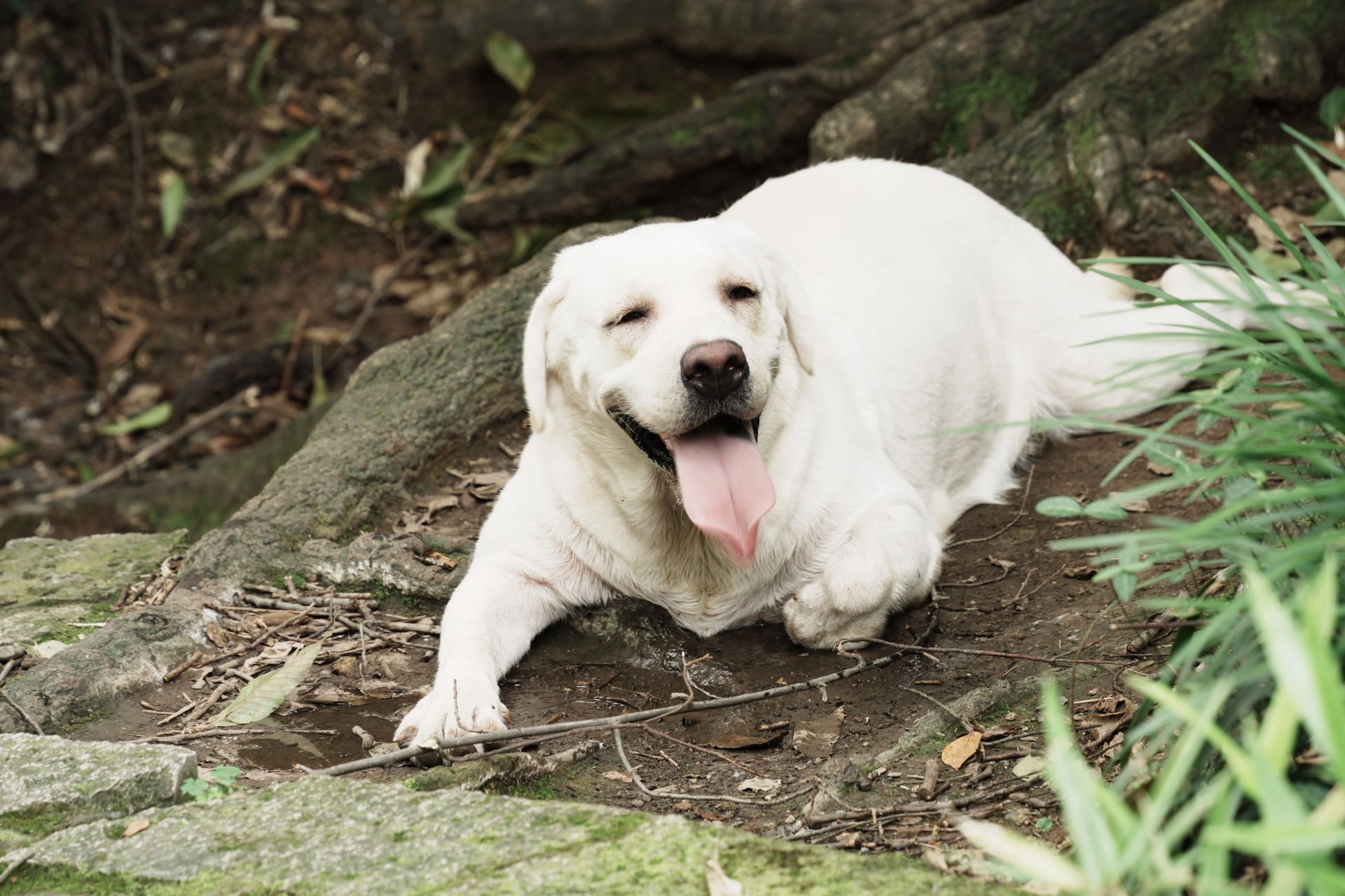 可爱的小狗。从小狗的反应就能知道今天有多热了。