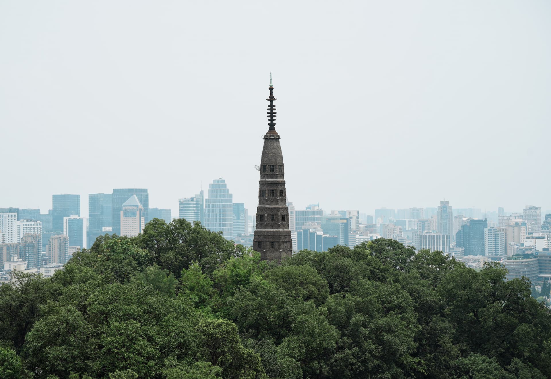 查了一下,湖对面山上的是六和塔,改正:城隍阁。